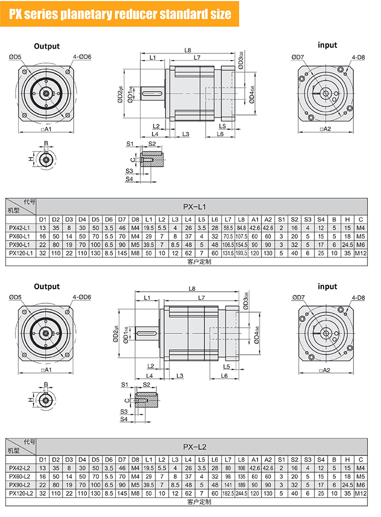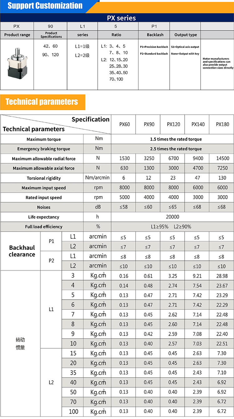 42mm 60mm 90mm 120mm Shaft Output PX Series Ratio Low Backlash Planetary Reducer Gearbox High Precision Planetary Gearbox PX42 PX60 PX90 PX120 Speed Reducers for Servo Stepper Motor 42mm 60mm 90mm 120mm PX Series High Precision Planetary Gear Reducer Gearbox With Printing Marin