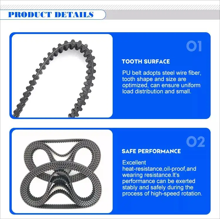 1. Produce all kinds of PU timing belts, including open type, connection type, seamless type, and various models and specifications are complete. 2. Specially processed various PU timing belts, with surface processed rubber (red, green, white), transparent TPU glue, sponge rubber, with surface processed baffles (various shapes and structures), de-toothed, slotted, punched. After the belt surface is thickened, the grooves are horizontally and vertically slotted (according to the specified shape). 3. Production and processing of PVC, PU, PE, silicone conveyor belts, processing guide bars, baffles, skirts. With surface processing wear-resistant rubber (red, green, white), patterned rubber, sponge. The belt can be slotted and punched. 4. Professional wholesale and retail of various types of rubber timing belts, thickened timing belts, and rubber V-ribbed belts, with more than 2,000 stock specifications. 5. Professional processing and wholesale of various domestic film-based transmission flat belts.