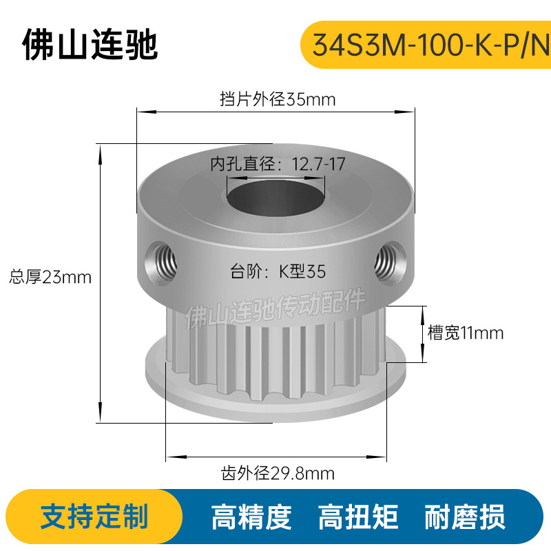 S3M 34 Teeth Timing Pulley with Flange 11 Groove Width BF Aluminum Pulley for CNC Applications 34S3M100-B-P/N12