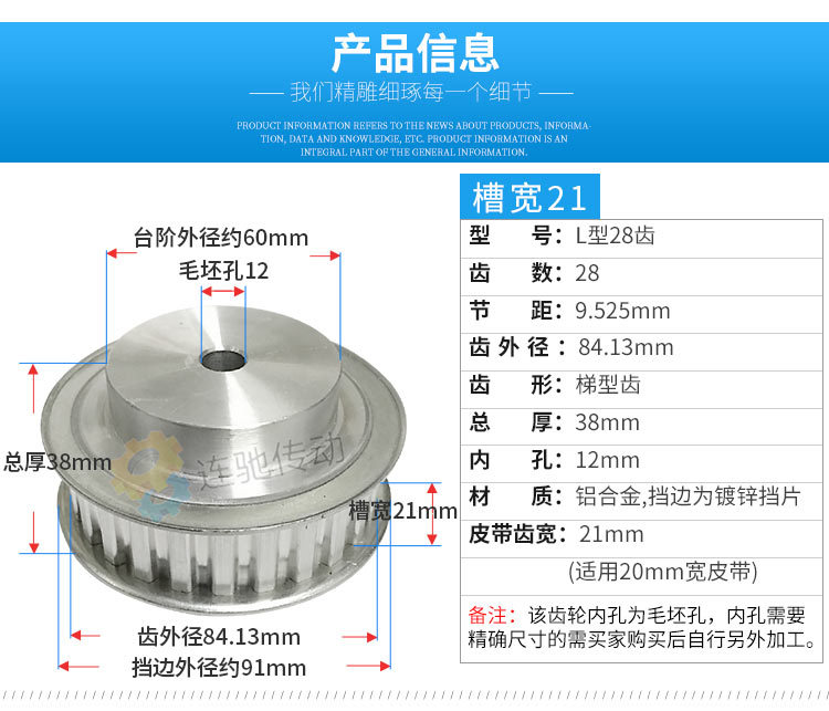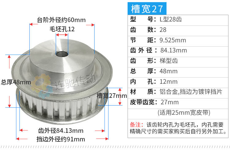 Type L Aluminum Alloy Timing Belt Pulley - L28 Teeth, Teeth Width 21/27, Teeth Pitch 9.525, Timing Pulley
