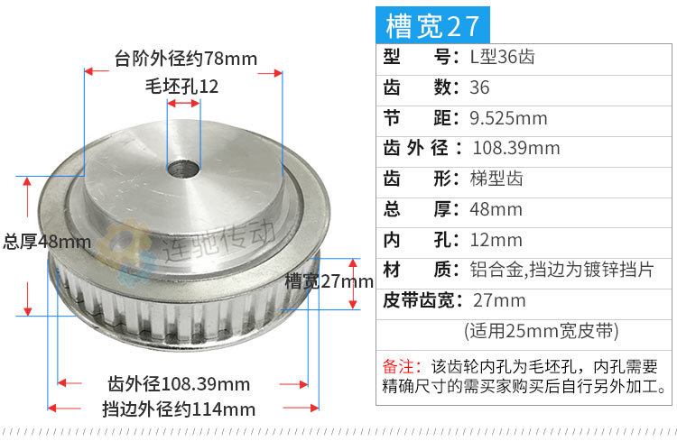 Type L Aluminum Alloy Timing Pulley L36 Teeth Teeth Width 21/27 Teeth Pitch 9.525 Timing Pulley