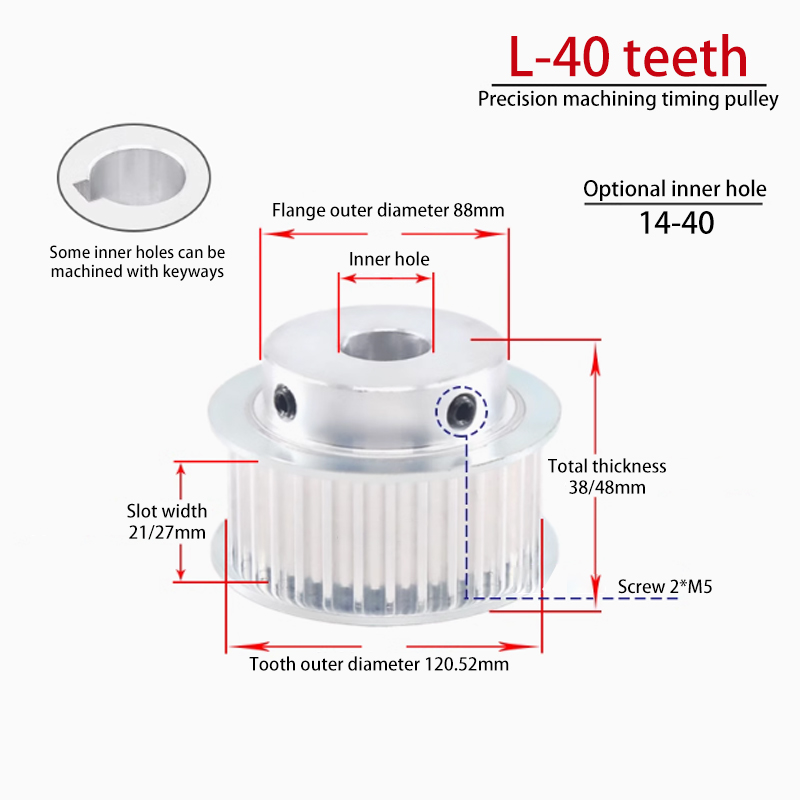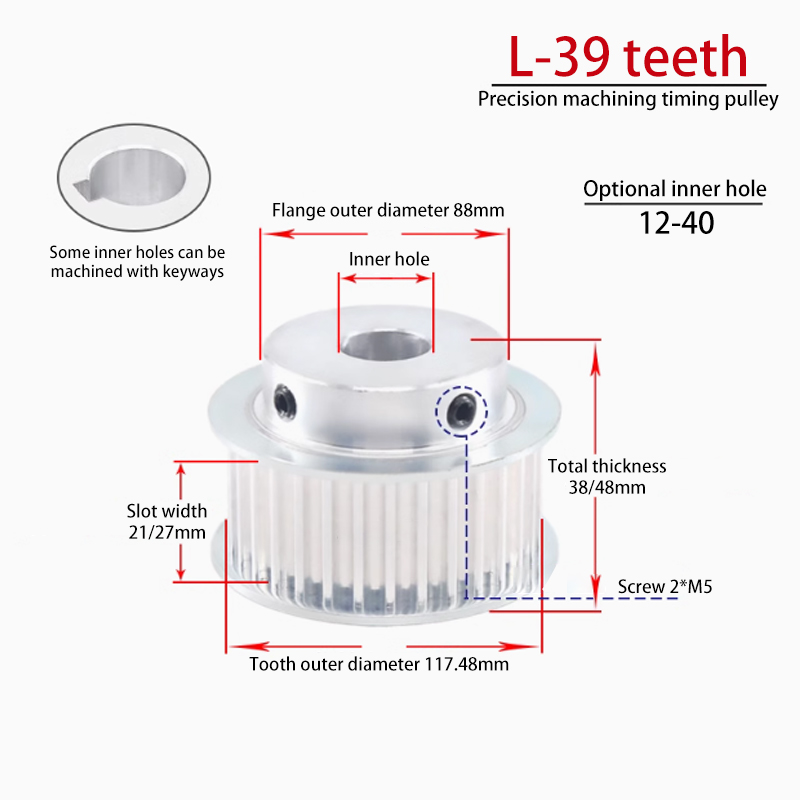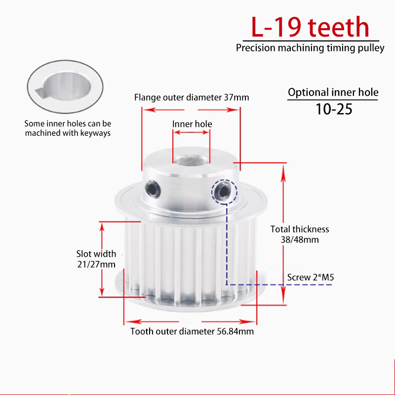 We offer a complete range of Timing Pulleys (Synchronous Belt Pulleys) compatible with major belt profiles, including HTD Timing Pulleys (3M, 5M, 8M, 14M, 20M), GT Timing Pulleys (GT2, GT3, GT4), T Series Timing Pulleys (T2.5, T5, T10, T20), AT Series Timing Pulleys (AT5, AT10, AT20), MXL / XL / L / H Inch Pitch Timing Pulleys, Poly Chain Sprockets, Double-Flange Timing Pulleys, Pilot Bore Timing Pulleys, Taper Lock Timing Pulleys, Idler Timing Pulleys, Custom Aluminum Timing Pulleys, Steel Timing Pulleys, and Stainless Steel Timing Pulleys. All timing pulleys are manufactured with high-precision CNC machining to ensure accurate tooth profiles, stable transmission, high torque capacity, low noise, and long service life, and are widely used in automation equipment, CNC machines, robotics, packaging machinery, printing machines, conveyors, and industrial power transmission systems. As a professional Timing Pulley Manufacturer and Supplier, we provide OEM and custom machining services based on drawings, belt specifications, or sample pulleys. If you cannot find the model you need, feel free to submit an inquiry or contact us via WhatsApp or call us at/WhatsApp +86 18002849592 for a fast quotation and a reliable, cost-effective timing pulley solution.